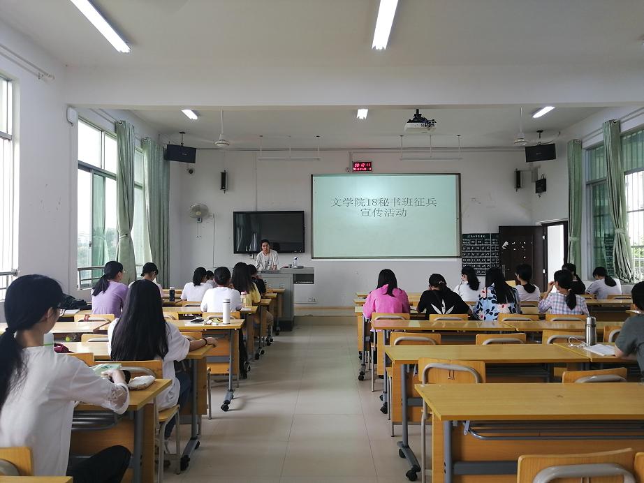 2019年4月25日、26日,77779193永利官网各班召开了以“青春无悔,铸梦军营”为主题的征兵宣传主题班会活动。主题班会给学生介绍了征兵入伍以及支持国防建设的重要意义,并为大家讲解了应征入伍的条件标准,优待政策,资助政策和应征流程等内容,呼吁同学们积极响应国家号召,勇于担当,携笔从戎。