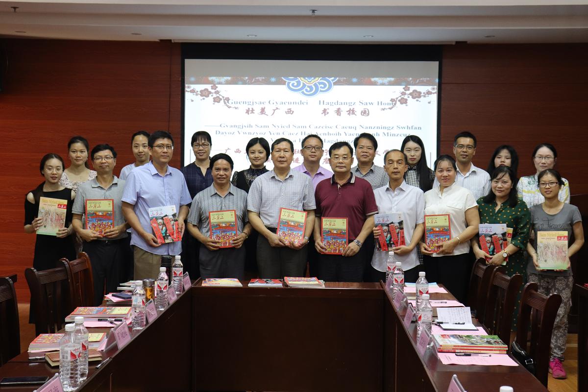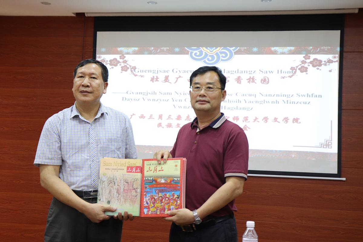 接下来,双方举行了赠书仪式。玉石副主任将三月三杂志社出版的优秀书籍赠送给我院,刘昌海书记代表我院向他们也致以了谢意,全体座谈会人员在融洽的氛围中合影留念。在自由交流环节,我院林安宁副院长、黄毅教授、黄桂秋研究员各抒己见,诉说自己与三月三杂志社的缘分与过往。随后,农莉芳副院长表示,希望双方能够建立实习基地,把我院优秀学生于三月三杂志社能更紧密相结合起来,在增强我院学生实践能力的同时共同促进广西民族文化的传播。接着,我院研究生与本科生代表也纷纷踊跃进行了发言,将座谈会的气氛推向高潮。