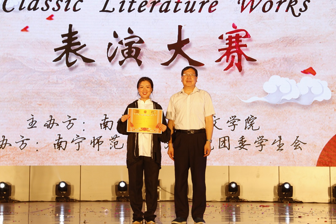 随后,刘昌海书记、林柳副部(处)长、石勇副院长、农莉芳副院长、林安宁副院长等领导依次上台为获奖的班级颁奖。17陶班出演的《红色娘子军》荣获一等奖,17汉本四班的《纪念刘和珍君》和18汉本二班的《三块钱国币》荣获二等奖,18汉本三班的《欧也妮葛朗台》等五个节目荣获三等奖。节目《红色娘子军》获得最佳剧本奖、节目《爱丽丝梦游仙境》获得最佳服装道具奖,18戏剧影视文学班获得最佳组织奖。