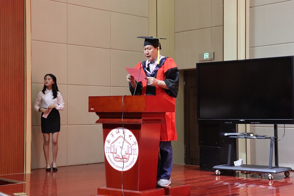 接着杨航代表2019届毕业生发言。杨航表达了对学校的不舍之情以及感激之情,最后他以一句“天南地北,我们永远文院人”表达了所有文苑人的感受。