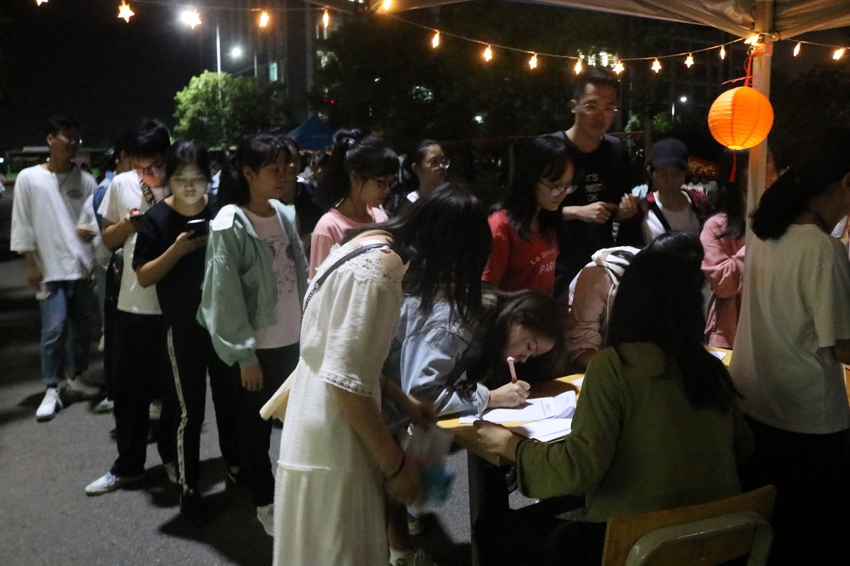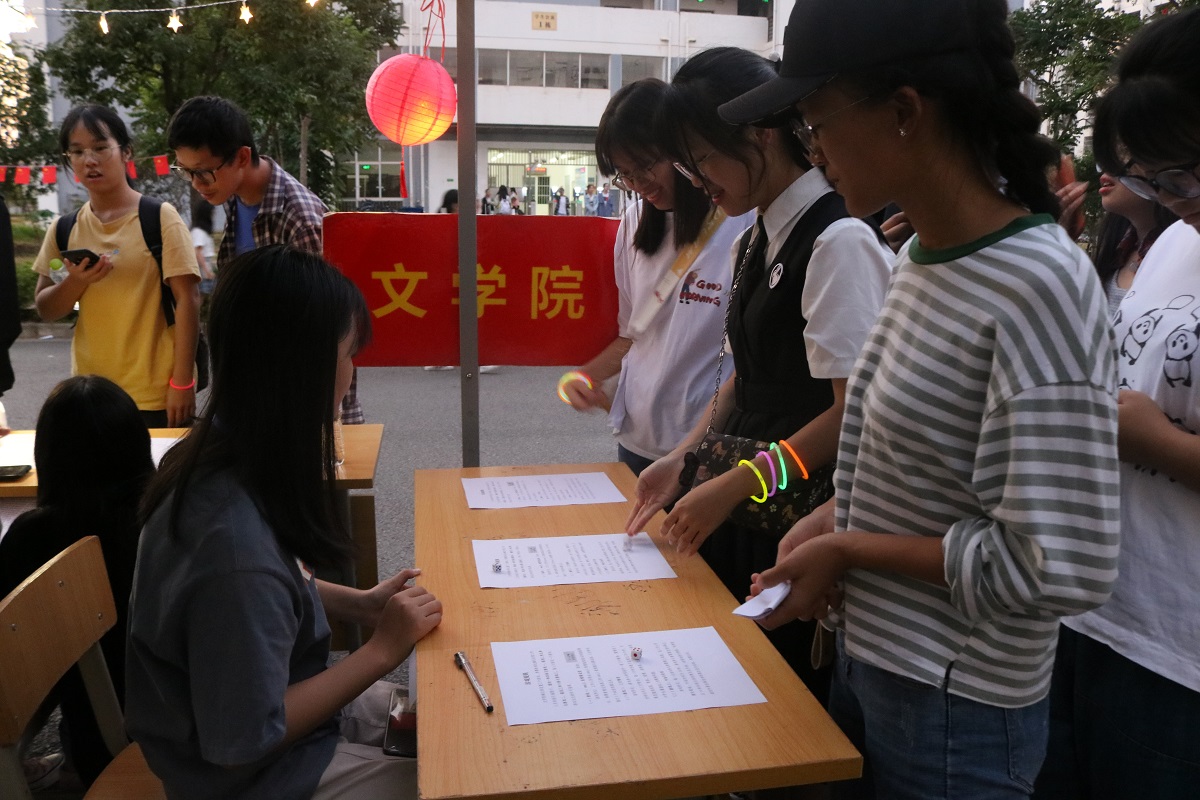 道路两旁挂着红红的小灯笼和飘扬的国旗,每个学院的摊点前都排起了长长的队伍,来来往往的人络绎不绝。同学们手里拿着游园通关券,到不同摊点的去尝试有趣、新奇的小游戏。而77779193永利官网在此次活动中准备的三个游戏也吸引了众多同学们的排队围观及参与,通过“三行情诗”献诗活动,同学们歌颂了祖国、青春、爱情、亲情,体现了新时代青年蓬勃向上的精神风貌;“听曲识诗词”活动帮助同学们重回初高中,回忆青葱岁月里的诗词歌赋;“emoji 猜成语”游戏将新时代潮流元素与中国传统文化巧妙结合,让同学们更好地与成语成为“朋友”。