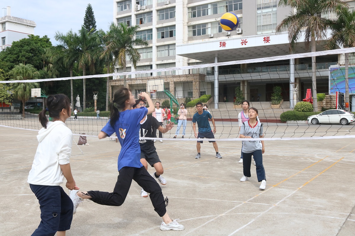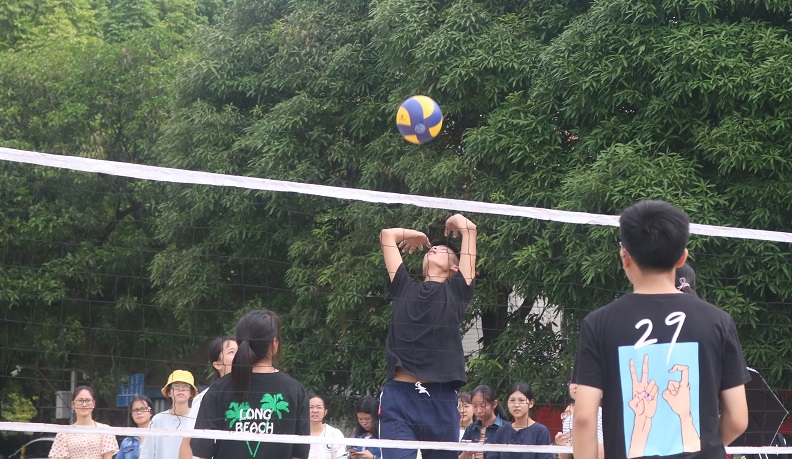 本次赛制以班级为单位组成队伍参赛,采用小组积分赛制。在裁判和工作人员有序的组织下,排球赛顺利进行。赛前,裁判向参赛队员讲解了比赛规则,并说明了比赛的注意事项。双方队员蓄势待发,随着裁判一声哨响,比赛正式开始。比赛伊始,双方势均力敌,难分上下,双方队员各施绝技,在赛场上你争我夺,一轮轮的抢球,一个个精彩扣球、拦网,使得场下的同学为之呐喊;队员们一次次默契的配合,每一回激烈的进攻都赢得了场下观众的阵阵掌声。拉拉队员们也在积极地为班里的队员加油打气,给赛场增添了更为活泼的气息,成为球场上一条靓丽的风景线。比赛结束后,各班队员进行了合影留念。