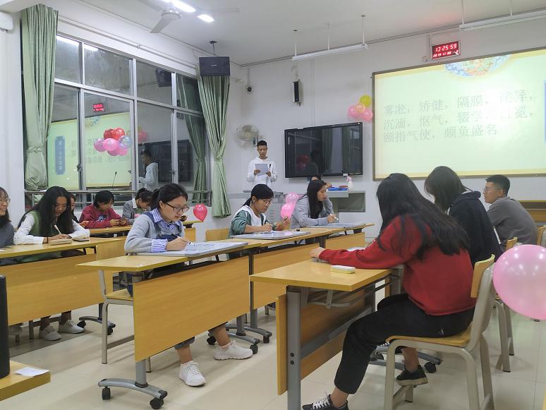 本次汉字听写大赛共分为音译推词、同字多词,推断成语三个环节。全班共分为六个参赛队伍,最后根据得分高低评出前三名。比赛过程中采取集体听写的形式,主持人统一计时,随后在大屏幕上展示各组的答题情况。整个比赛选手们用小黑板作答,竞争激烈,环节紧凑,公平公正公开。比赛内容丰富多彩,其中涉及容易使用错误的字、容易写错的字及与历史、人文、地理等有关联的字、词等……
