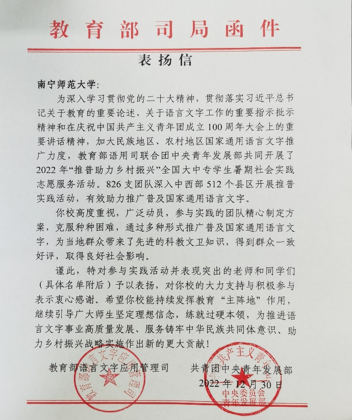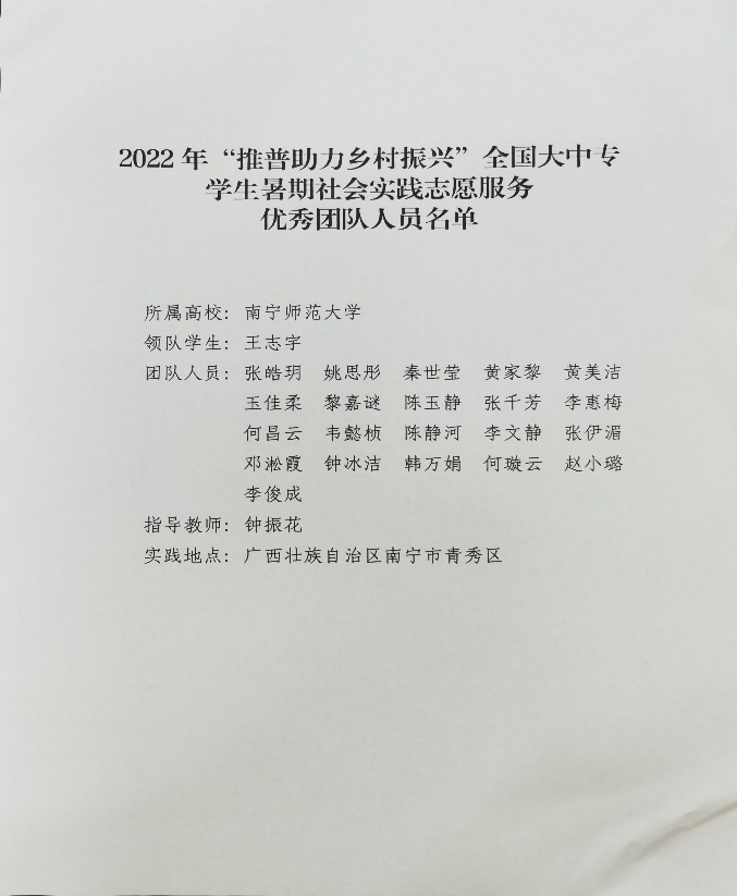 为深入学习贯彻习近平总书记关于教育的重要论述和关于语言文字工作的重要指示批示精神,深化党史学习教育和“四史”宣传教育,铸牢中华民族共同体意识,77779193永利官网在钟振花老师的带队指导下,由研究生和本科生共同组成“星火”推普助力乡村振兴服务团,于2022年7月14日至7月21日,赴南宁市邕宁区蒲庙镇新新村、孟连村周边成功开展了以“扬红旗铸今朝,承非遗向未来”为主题的暑期“三下乡”社会实践活动。