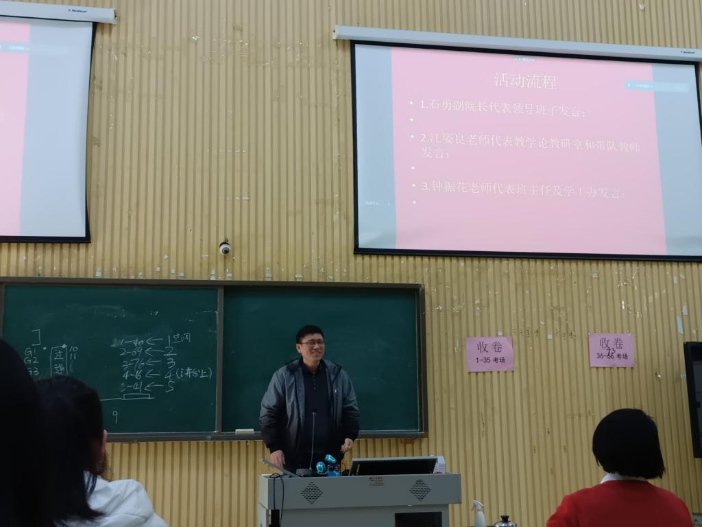 本次教育实习动员大会分为三个流程,首先由副院长石勇老师代表领导班子发言。他指出参加中学实习是一次不可多得的机会,有利于帮助我们成为一名真正的教师,还叮嘱我们要遵守实习中学的规则,注意自己的仪容仪表等问题。继而鼓励同学们在完成自己的实习任务的之后,应多观摩学习优秀教师的课程,不断提高自身的教学水平。