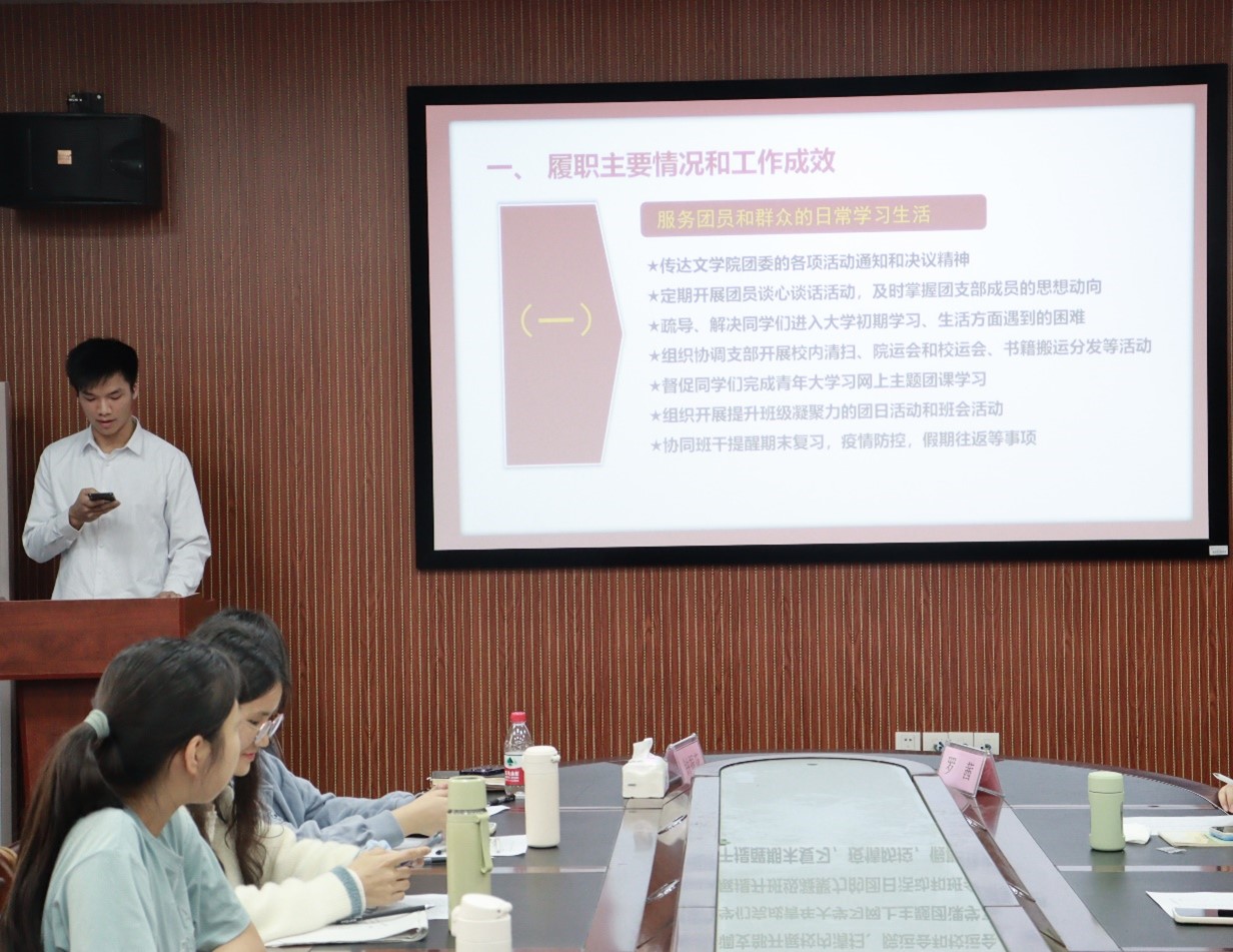 接下来,21-22级各班团支书依次上台进行了述职。在述职过程中,各班团支书对上个学期的班内情况进行了详细的阐述,总结了自身工作中的优点与不足,并表示会努力弥补不足,认真做好本职工作,继续秉着严谨踏实的工作态度,改进工作方法,提高工作效率,积极地为学院、为同学服务。