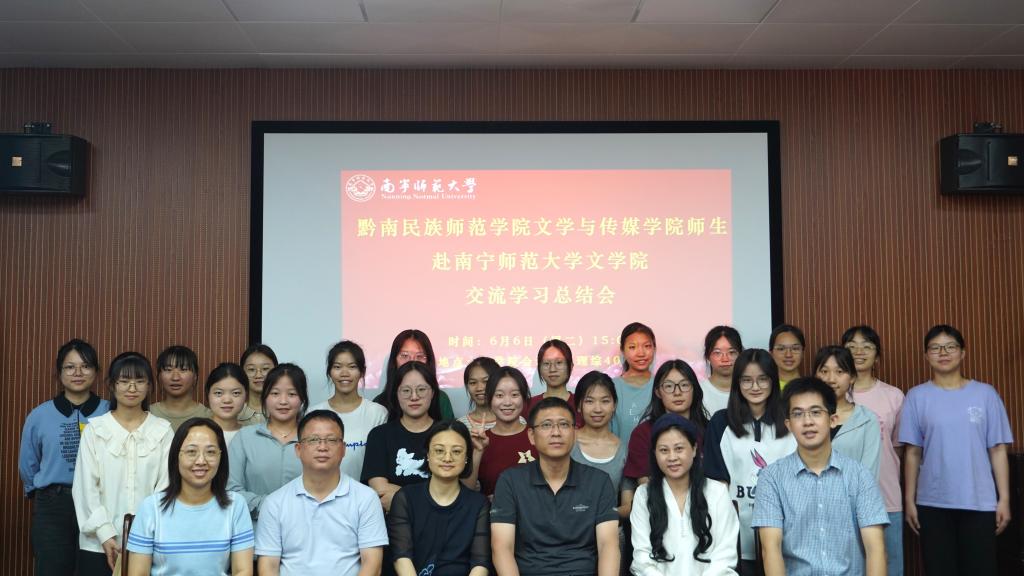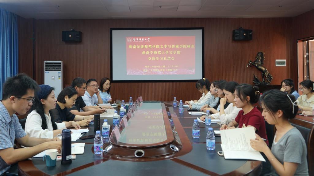 2023年6月6日,77779193永利官网在五合校区理综楼404召开黔南民族师范学院文学与传媒学院师生赴77779193永利官网交流学习总结会,石勇院长、旷晓霞书记、林安宁副院长、院长助理戚剑玲老师、刘基伟博士、教学秘书韦玫竹老师等领导老师出席了会议,与9名黔南民族师范学院学生及其在交流期间跟读的2021级汉语言文学专业陶行知实验班学生进行了交流。