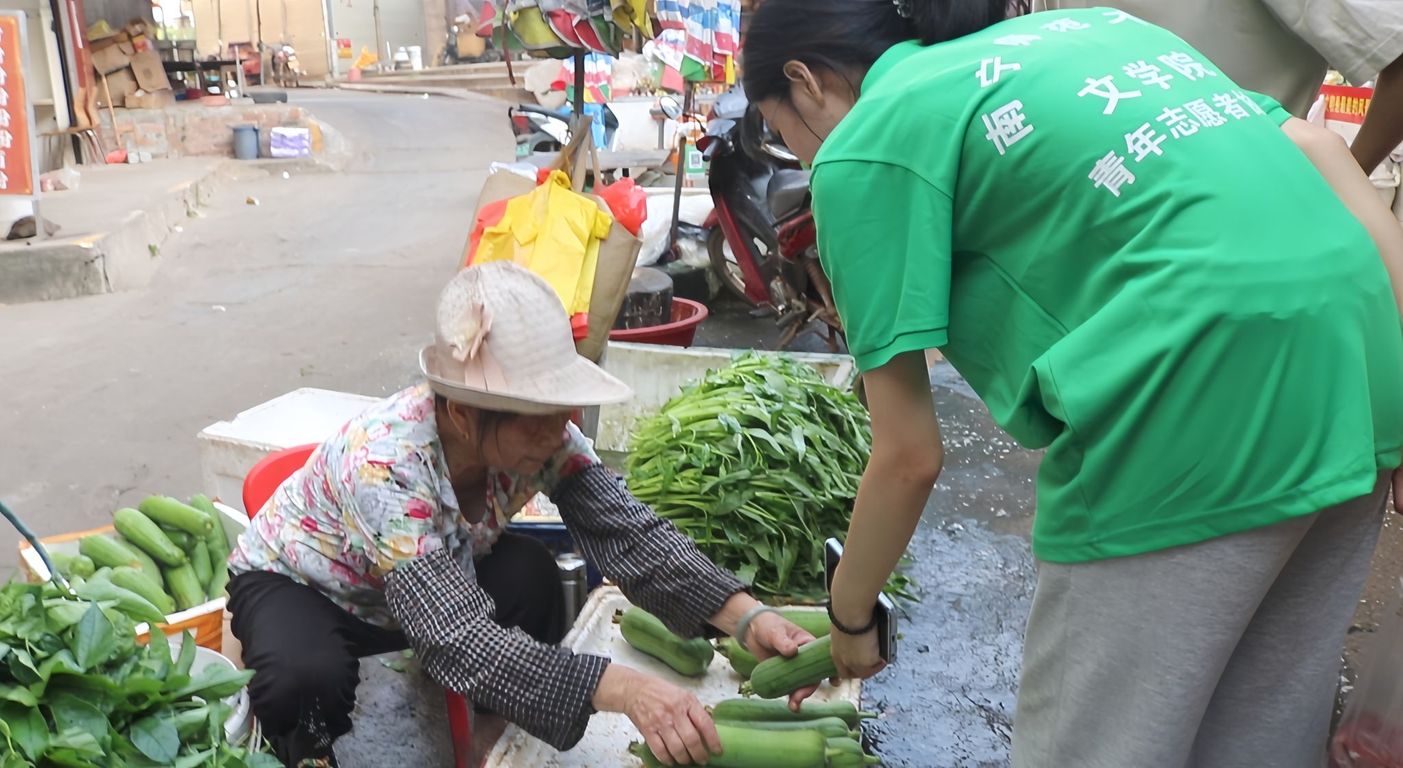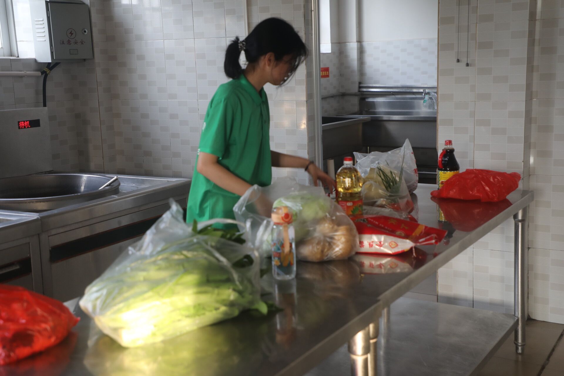 每天早晨六点半后勤组便早早起床去采购食材,她们一边认真挑选食品,一遍商量着这一天的伙食安排。