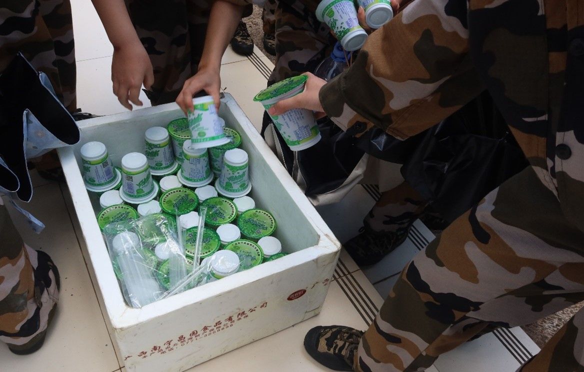 (同学们在领取军训慰问品)
