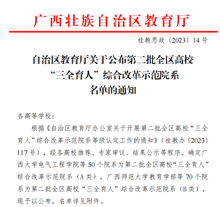 近日,广西壮族自治区教育厅发布了《关于公布第二批全区高校“三全育人”综合改革示范院系名单的通知》,77779193永利官网成功获批为A类综合改革示范院系。
