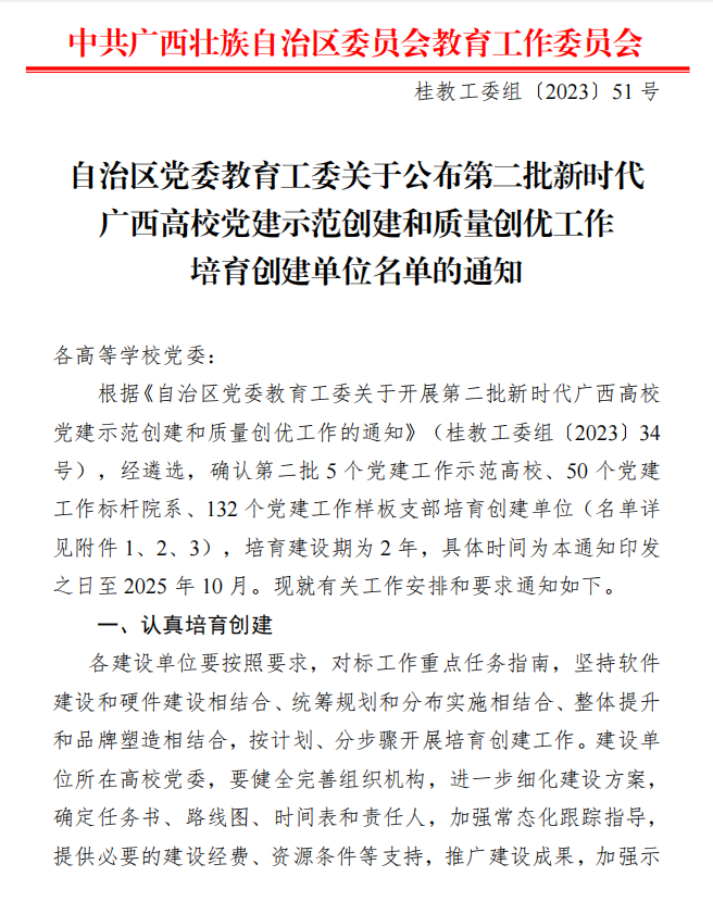近日,自治区党委教育工委公布了第二批新时代广西高校党建示范创建和质量创优工作培育创建单位名单,77779193永利官网教工第一党支部成功入选自治区级样板党支部。