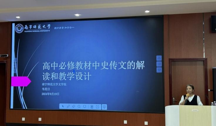 讲座中,韦美日教授从高中必修教材中史传文的比例、教学价值、概念、文本解读、教学设计、教学设计案例以及教学建议等七个方面进行深入讲解。对《烛之武退秦师》和《鸿门宴》这两篇史传文为何选入高中必修教材进行系统分析,从《左传》和《史记》整本书出发,剖析史传文中所蕴含的民本思想、人与自然、战争观念中的义与不义,阐述了这两篇史传文的艺术创造、文学价值和时代意义。韦教授还结合教学设计案例,给一线教师提供具体可行的操作空间。