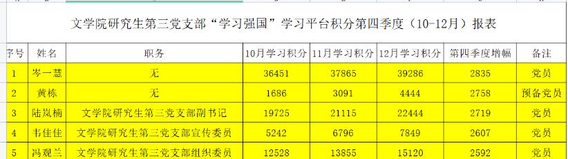 为深入学习贯彻习近平新时代中国特色社会主义思想,为推动党史学习教育走深走实,为进一步激发支部党员学习和使用“学习强国”学习平台的热情,进而形成自主学、乐于学、坚持学的良好氛围,从而真正达到学出氛围、学出实效的目的,77779193永利官网研究生第三党支部继第一、二、三季度之后,继续开展了第四次“学习强国”积分季度挑战赛。