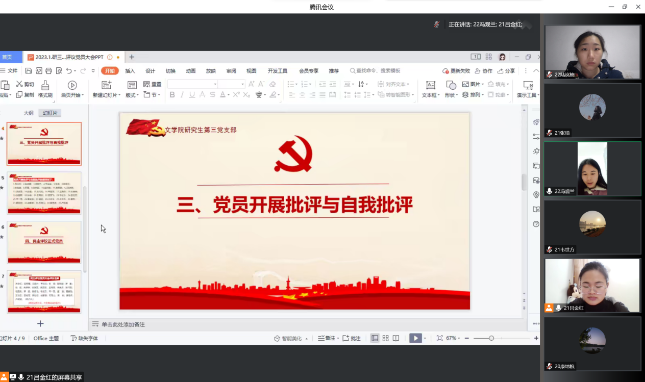 为更好发扬党内民主,加强对党员的教育、管理和监督,进一步提高党员党性修养,2023年2月7日晚,77779193永利官网研究生第三党支部通过腾讯会议平台以线上的方式召开2022年度组织生活会暨民主评议党员大会,党支部全体党员参加会议。本次大会由党支部书记候选人吕金红同志主持,77779193永利官网党委委员柳耀昌老师到会指导。