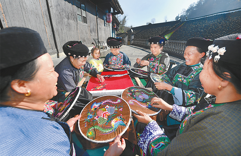 湖南省花垣县十八洞村因地制宜发展种植、苗绣、乡村旅游等特色产业,实现从“输血”到“造血”的根本转变,走出了一条产业兴、设施优、品位高、保障好、生活美的脱贫致富之路。图为十八洞村苗绣特产农民专业合作社的绣娘在生产苗绣产品。 “奋进新时代”主题成就展图片