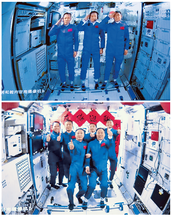 新时代十年,我国经济实力、科技实力、综合国力跃上新的大台阶,推进科技自立自强,创新型国家建设取得重大进展。图为拼版照片:上图为2021年6月17日神舟十二号3名航天员顺利进驻天和核心舱,标志着中国人首次进入自己的空间站(新华社记者 金立旺/摄)。下图为2023年5月30日在北京航天飞行控制中心拍摄的神舟十五号航天员乘组与神舟十六号航天员乘组拍下“全家福”的画面(新华社发 韩启扬/摄)。