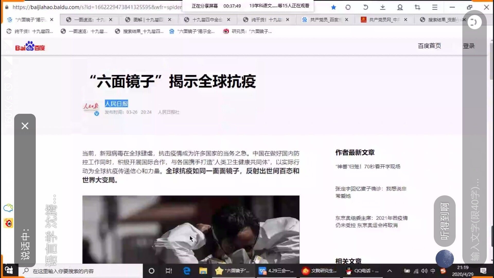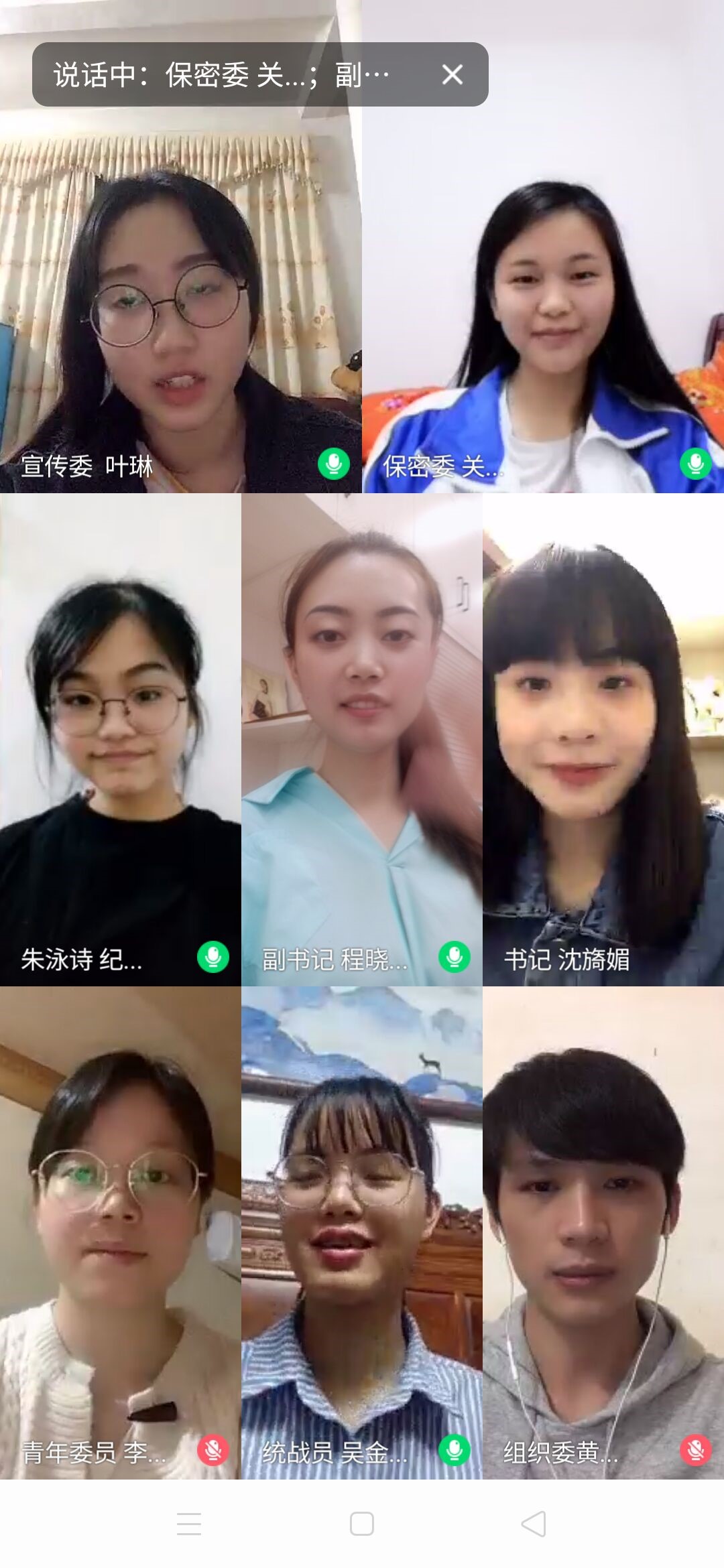 为深入贯彻学习党的十九届四中全会精神,学习在疫情防控期间优秀党员的精神品质和先进事迹,提高支部党员的思想品质,发挥支部的战斗堡垒作用,4月以来,虽受新冠肺炎疫情影响,支部党员响应国家号召居家隔离,但依旧运用网络视频、语音等功能按时开展党建工作和组织生活。