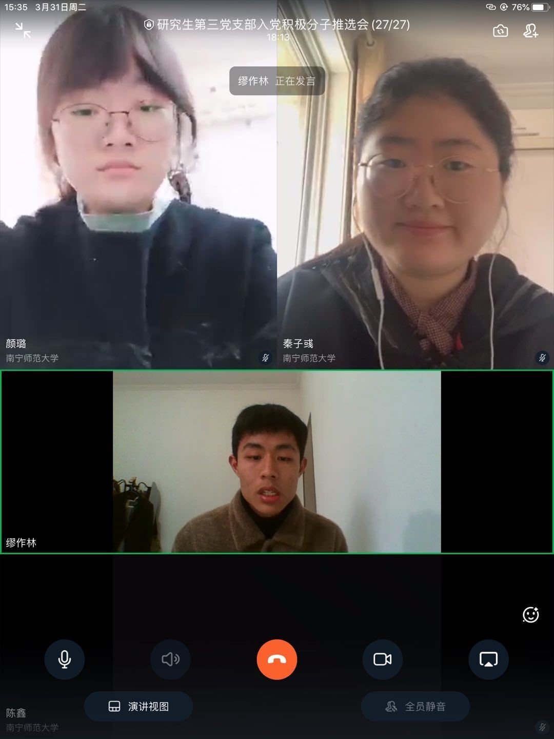 4月12日晚,77779193永利官网研究生第三党支部组织进行了4月的支部委员会。会议通过QQ语音和视频的形式进行,党支部全体支委均参加了会议。会议旨在总结近期工作及讨论本月组织生活会、专题学习会的会议议程。会议伊始,支部书记沈旖媚总结近期工作情况,她表示,近期主要完成了第五十六届入党积极分子推选、培训签到,预备党员培训签到,收缴支部党员党费等工作。随后会议讨论支部党建宣传工作的内容及分工。接着,会议继续讨论本月组织生活会、专题学习会的各项工作,确定会议议程。