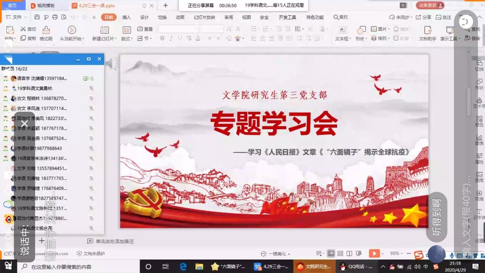 4月16日晚,77779193永利官网研究生第三党支部在QQ群课堂召开专题学习会暨4月组织生活会。会议由77779193永利官网研究生第三党支部书记沈旖媚主持,77779193永利官网研究生第三党支部全体学生党员及预备党员均参加了会议。此次专题学习会的主要内容为:学习《人民日报》3月26日文章《“六面镜子”揭示全球抗疫》。各同志在线上一同阅读了这篇文章,并踊跃发表了自己对文章内容和事件的看法。程晓林同志表示:“当前,面对新冠肺炎疫情在全球蔓延的严峻形势,不应该幸灾乐祸或者淡然冷漠,各国应该齐心协力共同抗疫,打造人类卫生健康共同体”。专题学习会结束后,紧接着召开组织生活会,各党员同志分别从思想、学习、生活、工作等方面对自己近阶段的表现进行了深刻的自我批评,其他党员同志也对其进行了批评和建议。