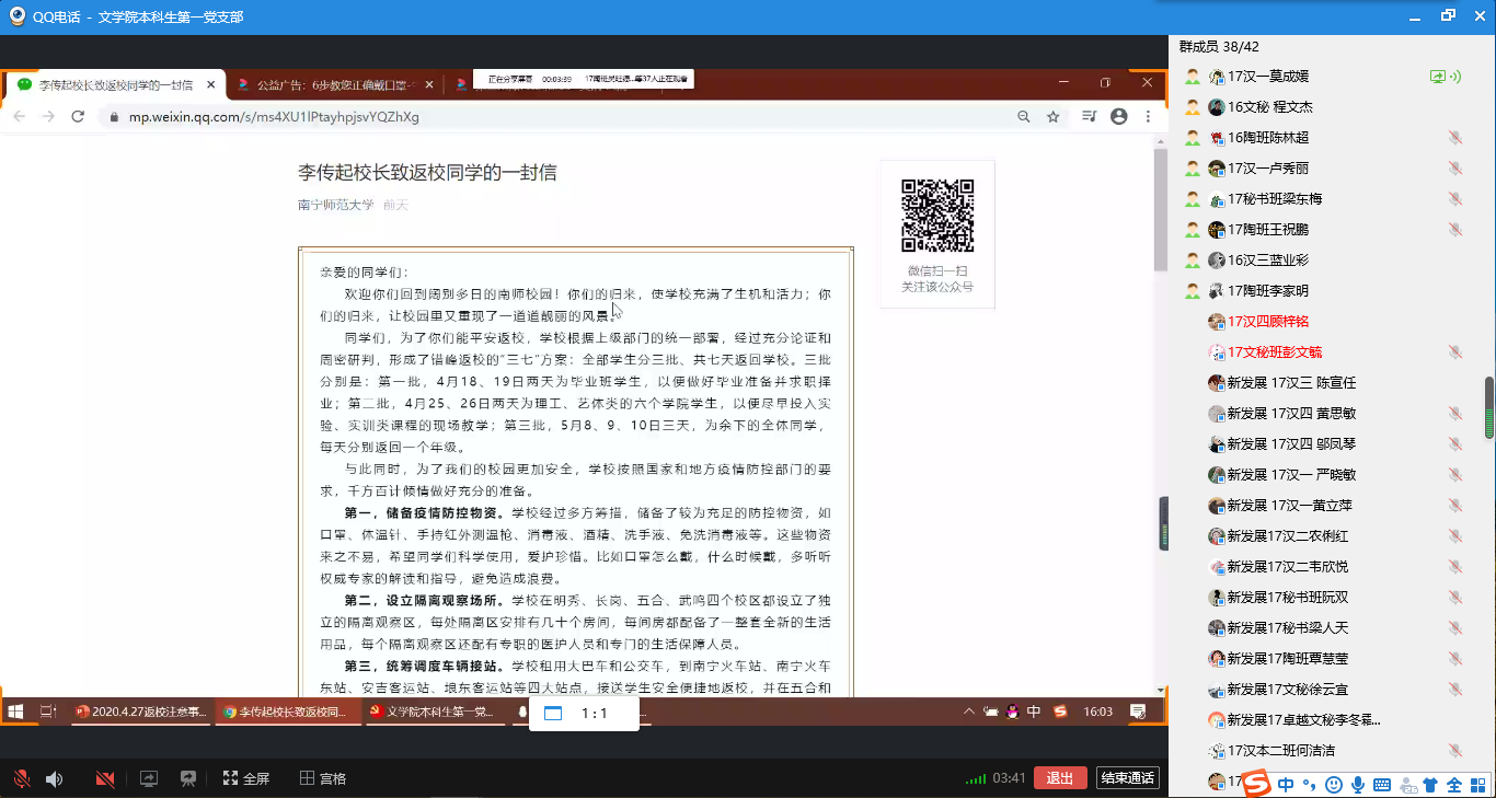 为加强疫情防控教育,配合学校做好安全返校工作。4月29日,我支部召开了“安全返校应知应会知识”专题学习会。会议结合抗击肺炎疫情,学习了《“六面镜子”揭示全球抗疫》一文,增强支部党员对抗击肺炎疫情的深入了解。根据学校错峰返校的“三七”方案安排,支部大部分党员同志将于5月8日返校,本次会议也就做好安全返校工作学习了《李传起校长致返校同学的一封信》、正确佩戴口罩、正确洗手的方法和其他一些返校注意事项,提高了党员同志的疫情防控意识,也为安全返校工作顺利开展奠定基础。