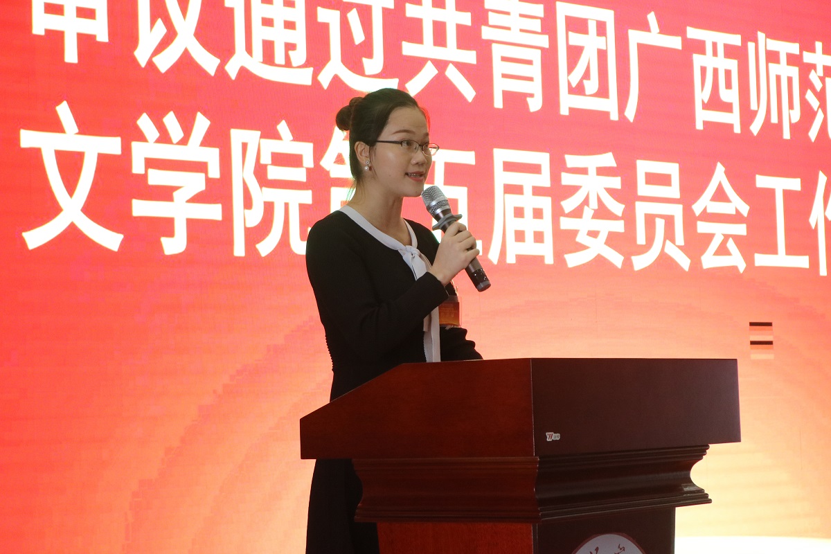 校学生会代表在致贺词时肯定了77779193永利官网学生会取得的成绩,并希望77779193永利官网学生会与校学生会加强联系,相互配合,共同进步,认真贯彻落实好学校的各项工作部署。接着,77779193永利官网团委书记钟振花老师对共青团广西师范学院77779193永利官网第五届委员会工作进行汇报,她详细地向大家介绍了77779193永利官网开展的各项工作以及取得的成绩。钟老师的工作报告结束后,由前学生会主席冯宇上台作第五届学生委员会工作报告。
