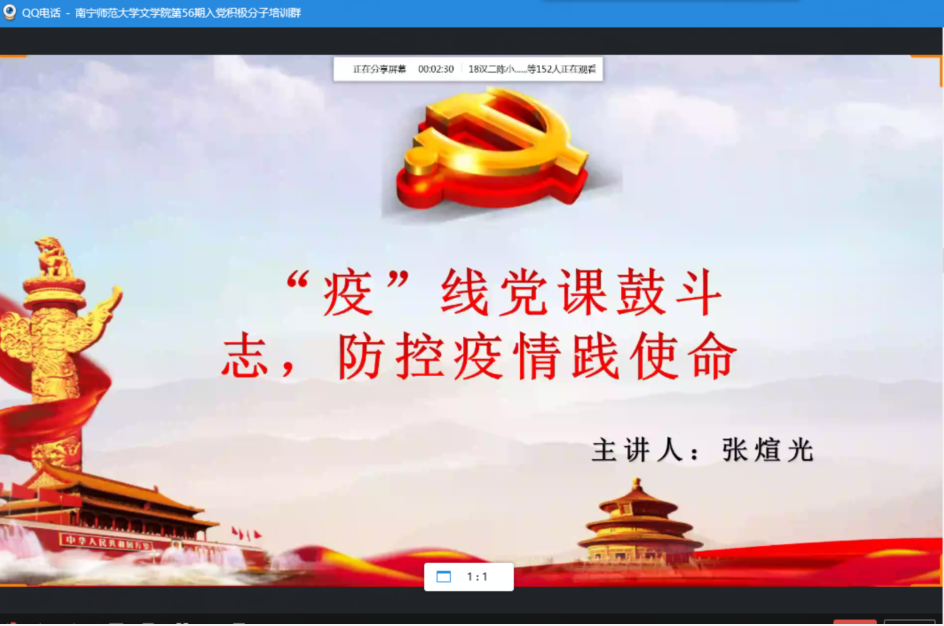 4月11日上午,党务办主任张煊光老师为学员作《“疫”线党课鼓斗志,防控疫情践使命》党课,提出这次疫情阻击战反映了党中央的坚强领导和各级政府的高效应急处置能力,透过这场战“疫”,要看到党的领导始终是战胜一切艰难险阻的“关键核心”,要认识到我们国家的优势,发挥优势去帮助别人。初心易得,始终难守,张老师告诫每一位入党积极分子不要忘记自己的入党初心,要端正入党动机,承担起相应的责任和使命;要珍惜成果,坚持科学防控;努力学习,报效家国;头脑清晰,明辨是非;要明确我们国家的制度优势,为社会为家国做贡献。