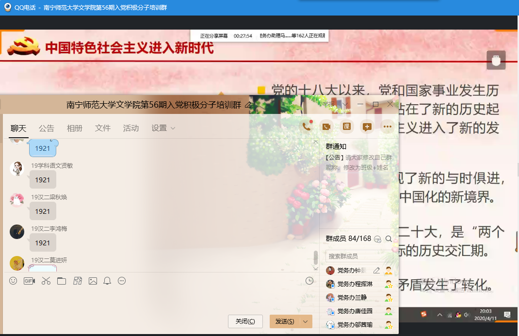 为深入贯彻习近平总书记关于新冠肺炎疫情防控的重要讲话精神,进一步加强入党积极分子队伍建设,端正其入党动机,77779193永利官网党委积极响应“停课不停教,停课不停学”的号召,贯彻落实学校党委、党校关于作好党员发展工作的部署,积极加强对入党积极分子的培养、教育和考察。77779193永利官网党委、77779193永利官网分党校依据《中国共产党发展党员工作细则》、《普通高等学校学生党建工作标准》的规定和具体要求,结合当前疫情防控时期工作实际,于2020年4月10日至2020年4月11日开展第56期入党积极分子线上培训工作,全院本科生、研究生共159名入党积极分子参加了此次培训。