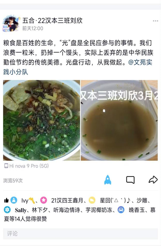 本次活动形式丰富多样,内容创意新颖,共包括三个部分。第一个活动内容是参与同学进行以“成由勤俭败由奢,倡导光盘净餐桌”的5 天打卡活动中,同学们通过QQ空间分享自己参与“光盘行动”的照片和心得进行打卡。第二个活动为“践行垃圾分类,共树文明新风”,同学们分别通过线上问卷和线下问卷两种形式积极参与有关垃圾分类问题调查活动,来进一步掌握垃圾分类的知识并提高垃圾分类的意识。第三个活动内容为“同饮一江水,共护生态美”,活动当天,同学们手持垃圾袋和清扫工具,对邕江附近路段进行垃圾清扫、拾捡废弃物。参与的同学们互相配合,相互协助,全部都成了“弯腰一族”。清扫结束后,同学们在邕江岸边合影留念。