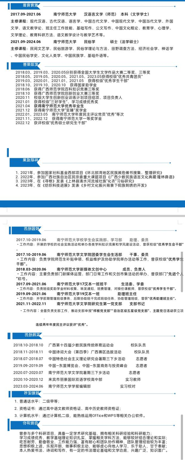 学习上他勤奋刻苦,课堂上和老师积极互动,活跃课堂氛围,深受老师和同学的喜爱,学习成绩也位居班级前列。学习之余,他积极参加各项赛事,作为校队成员参与了中国诗词大会第四季广西赛区选拔赛和广西第十四届少数民族传统体育运动会等文体活动。课后,他还热衷于请教老师,不断思考,积极进取,最终考上了本校民俗学专业的研究生。研究生期间,他在导师的指导下参与了国家级和区级社科基金项目,参加了中国民俗学会学术研讨会等学术会议,发表了两篇专业学术论文,读研期间获得两次一等学业奖学金。