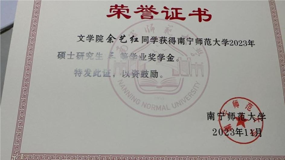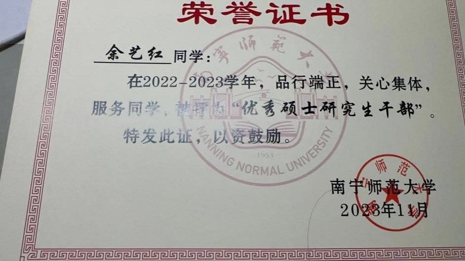 自入校以来,余艺红同学就树立了清晰明确的奋斗目标,致力于提高自我学习、自我监督和自我管理的个人素养和专业素养。在研究生学习阶段,她乐于参加各类实践活动并将此作为历练自我,提高能力的机会,先后参加了学校举行的各类讲座,文学沙龙活动以及由中国作家协会《诗刊》社、中共南宁市委宣传部主办的南宁诗歌周等多项实践活动。于2022年、2023年连续两年获校级三等奖学金。